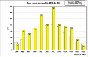 Met landelijk gemiddeld 2090 uur zon lag het aantal zonuren dichtbij dat in 2003, dat met 2099 uur het zonnigste jaar sinds 1901 was. Normaal is 1639 uur. Vrijwel alle maanden waren zonniger dan normaal, alleen januari was duidelijk somberder dan normaal. Het minst zonnig was het in het noorden met in Lauwersoog 2018 uur zon. In het In De Bilt kwamen voor: Jaar 2018 Normaal 3 8 IJsdagen (max. temp. lager dan 0,0 °C) 50 58 Vorstdagen (min. temp. lager dan 0,0 °C) 132 85 Warme dagen (max. temp. 20,0 °C of hoger) 55 26 Zomerse dagen (max. temp. 25,0 °C of hoger) 9 4 Tropische dagen (max. temp. 30,0 °C of hoger) zuidwesten was het het zonnigst: in Vlissingen scheen de zon ruim 2150 uur. Vooral opvallend was de uitzonderlijk zonnige maand juli met in De Bilt een totaal aantal zonuren van maar liefst 341 uur, tegen 206 uur normaal. Hiermee komt de maand gemakkelijk op de eerste plaats in de lijst met zonnigste julimaanden sinds 1901; het vorige record van 307 uur stamt uit 1904. Het zonnigst was het in het westen en midden van het land.