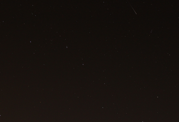 Het is misschien een zoekplaatje, maar je ziet een 'vallende ster'. Meteoren worden ze in de volksmond ook wel genoemd. In werkelijkheid gaat het niet om sterren die vallen, maar om miniscule stukjes steen en gruis die onder hoge snelheden de aardatmosfeer binnenkomen en op ongeveer 80–120 km hoogte verdampen. (Bron: hemel.waarnemen.com)